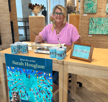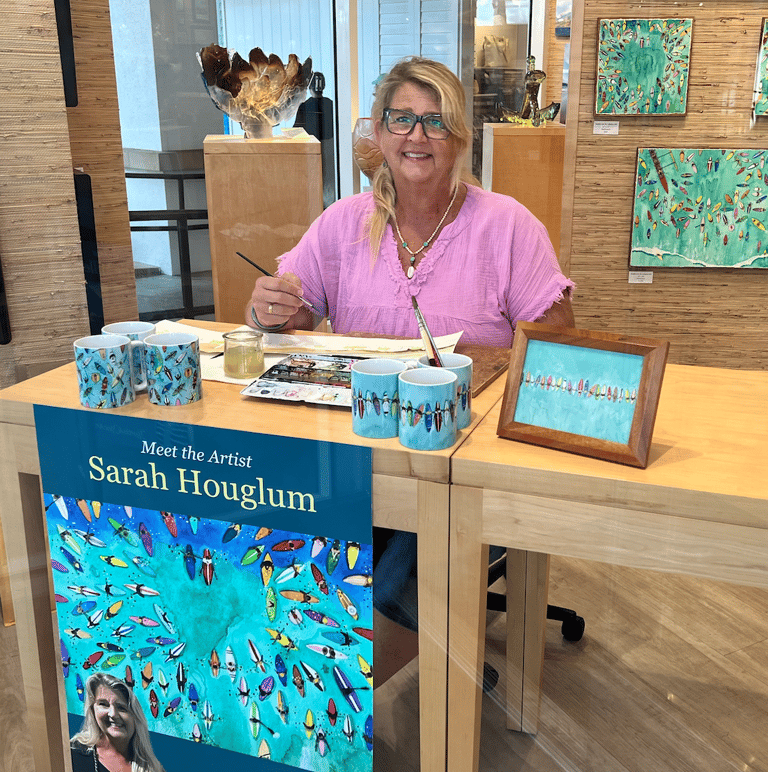 A member of the Lahaina Arts Society and a featured artist at Martin & MacArthur Galleries in both Maui locations, Sarah’s work has been celebrated for its bright, cheerful palette and uplifting island-inspired creativity. Most days, you’ll find her in her Florida studio, painting new pieces with her Boston Terrier, Frankie, at her feet.